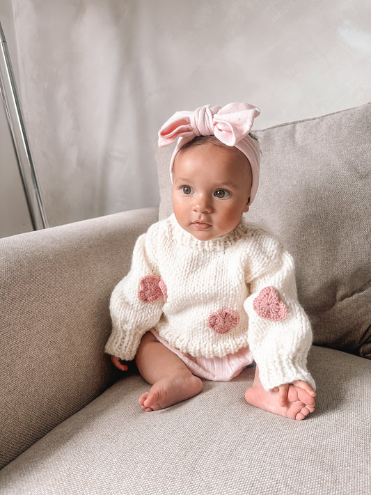 Hand knitted flower and chunky bow cardigan baby pink and cream