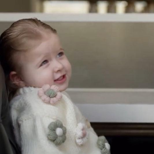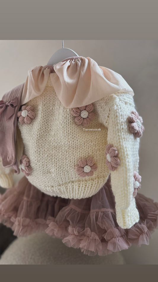 Handknitted cream flower cardigan, top, tutu and tights 4 piece set