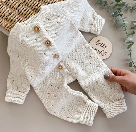 ‘Coming home’ handknitted collection romper/blanket/bonnet/booties