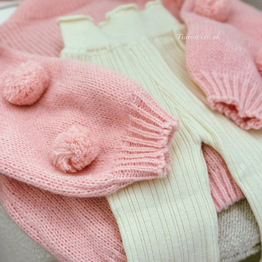 Handknitted pink flower cardigan, top, tutu and tights 4 piece set