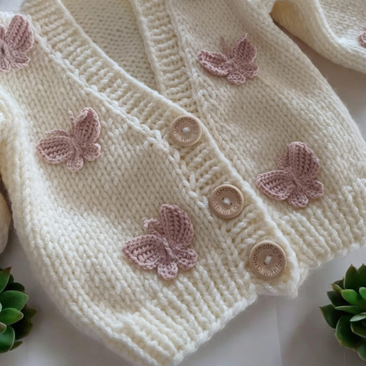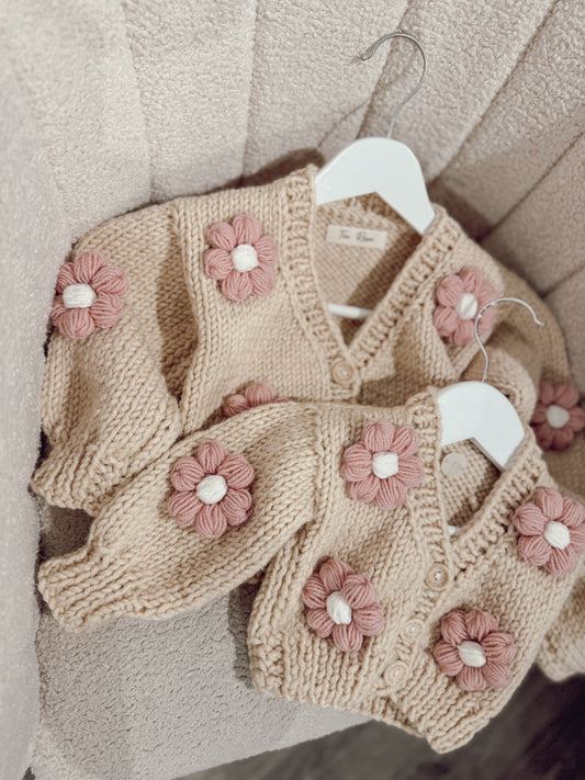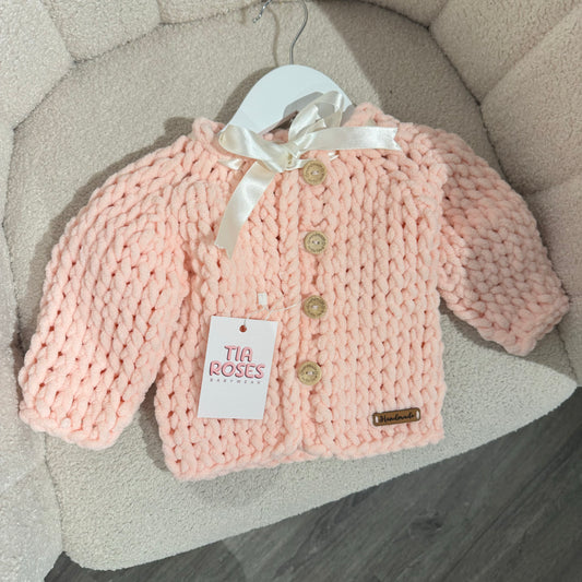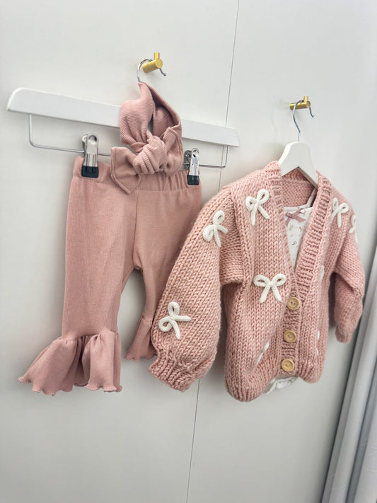 Hand knitted flower and chunky bow cardigan baby pink and cream