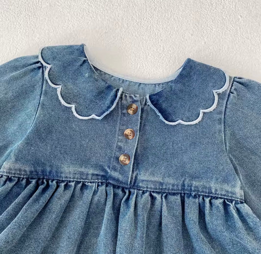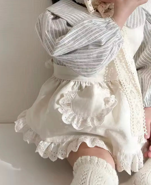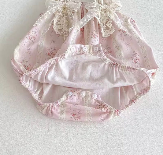 ‘She’s here’ embroidered baby pink frill romper & headband set
