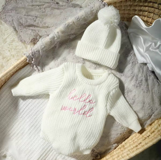 Pre order ‘Hello World’ embroidered chunky romper and hat