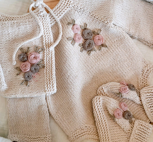 Mama and me handknitted beige flower 2 cardigan set