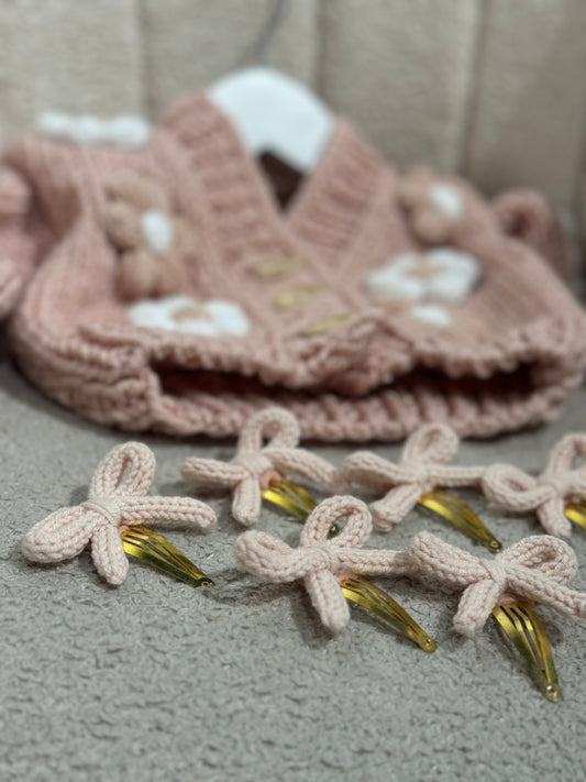 Pre order pink bow hand knitted hair clip (matches our bow cardigan)