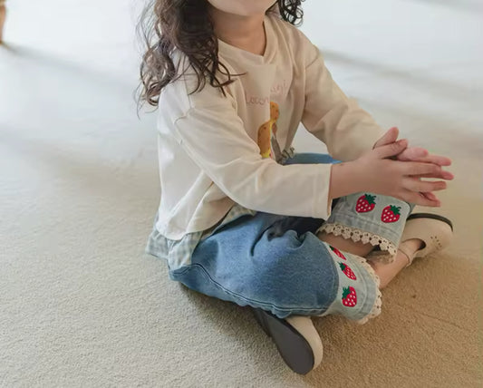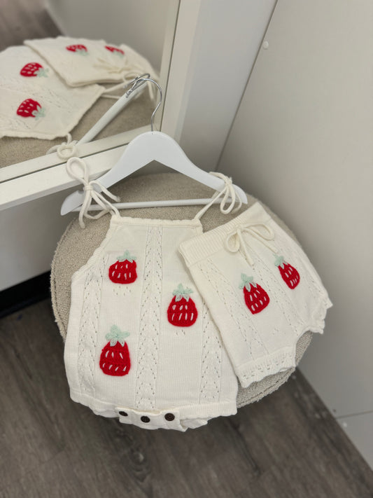 In stock Spring summer embroidered strawberry white cotton knit two piece set