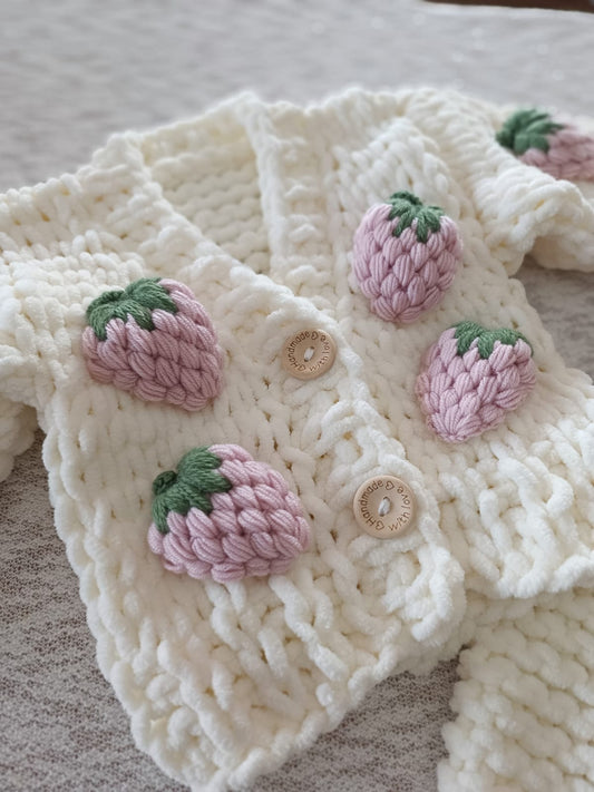 Pre order Soft white hand knit knit pink strawberry cardigan
