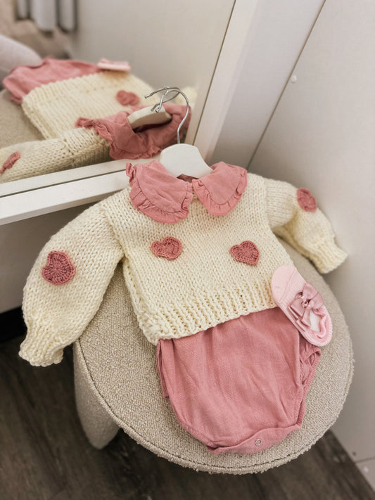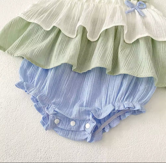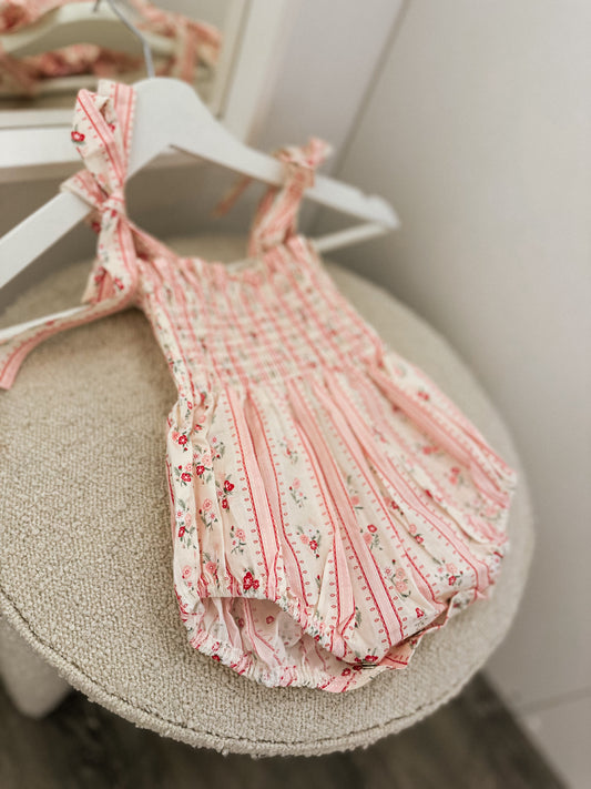 In stock spring/summer cherry pink ruffle romper and cherry print headband